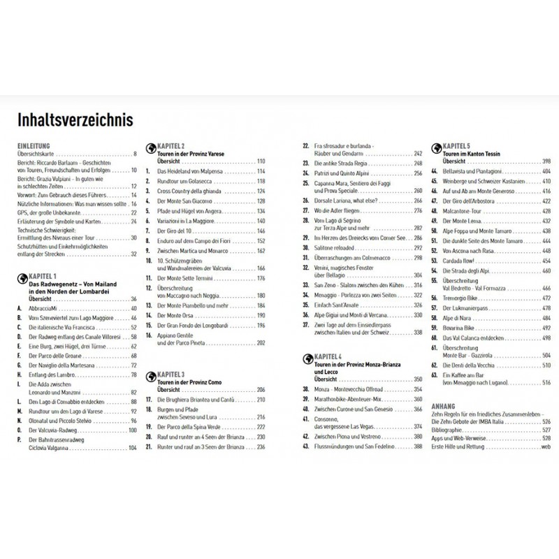 Dieser Führer ist nach ansteigenden Schwierigkeitsgrad aufgebaut. Er enthält Radwege, hügelige Strecken und Touren zu den Gipfeln mit Anstiegen, die Training erfordern sowie Abfahrten, die Technik voraussetzen. Bei allen gibt es besondere Highlights, die man nicht verpassen sollte – von einem versteckten Aussichtspunkt bis hin zu einem adrenalingeladenen Stück Weg – sowie eine Anbindung an den öffentlichen Nahverkehr, weshalb diese Leidenschaft fast als „CO2-neutral“ bezeichnet werden kann.
