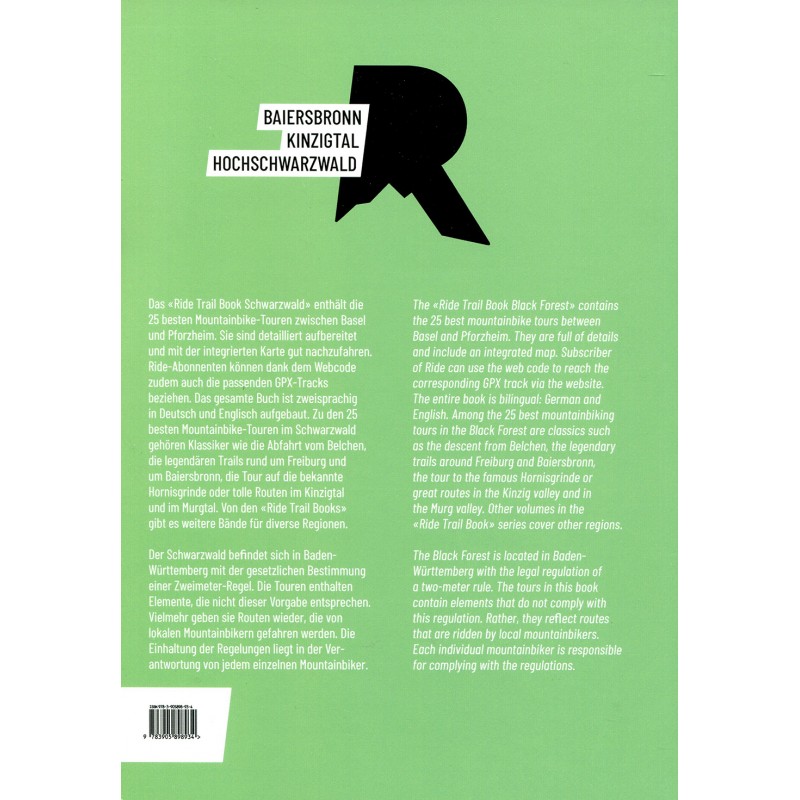 Das «Ride Trail Book Schwarzwald» enthält die 25 besten Mountainbike-Touren im Grossraum Schwarzwald. Sie sind detailliert aufbereitet und mit der integrierten Karte gut nachzufahren. Das gesamte Buch ist zweisprachig in Deutsch und Englisch aufgebaut. Zu den 25 besten Mountainbike-Touren der Region Schwarzwald gehört die Merkur Trail Runde, die Baiersbronn Trail - Umrundung und die Todtnau Trail Tour.