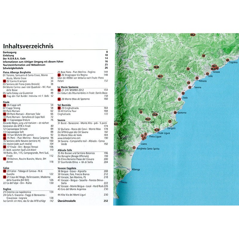 Dieser Führer stellte eine Auswahl von 44 Rundtouren zwischen Finale Ligure, Varazze und dem Beigua Park (UNESCO Geopark) vor, die mit den besten und technisch anspruchsvollsten Trails der Region aufwarten. Gratwege, Weltcup-Trails, Steilkurven in tollen Buchenwäldern verbunden mit Schotterwegen und Pfaden, die zu interessanten Punkten, aber auch immer wieder, teils auf Abfahrten die eine gute Portion Adrenalin versprechen, zurück zum Ausgangspunkt führen. Die Touren werden auf kleinen Karten sowie einem Höhenprofil skizziert und in Worten beschrieben. Zum Führer gehört ein Code zum Download der GPS-Tracks, mit denen man die Touren problemlos nachfahren und sich ohne zu lesen, voll auf das Gelände konzentrieren kann. Nach der Tour laden kleine Texte und Geschichten zum Schmökern ein, diesen "Bikerspielplatz" und seine lokalen Persönlichkeiten kennen zu lernen.