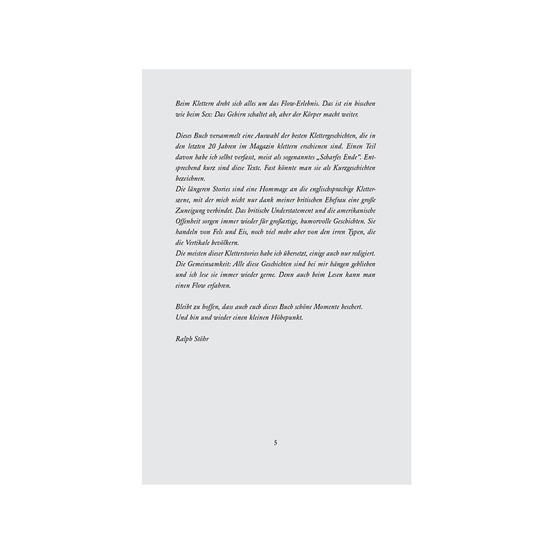 Die Kletterwelt wird seit eh und je von komischen Vögeln bevölkert, die für das Erlebnis in der Wand Ungemach auf sich nehmen, bei dem sich normale Menschen dezent an die Schläfe tippen. Dieses Buch enthält eine Auswahl der besten und schrägsten Geschichten, die in den letzten 20 Jahren in der Zeitschrift klettern erschienen sind – gesammelt oder geschrieben von Ralph Stöhr.