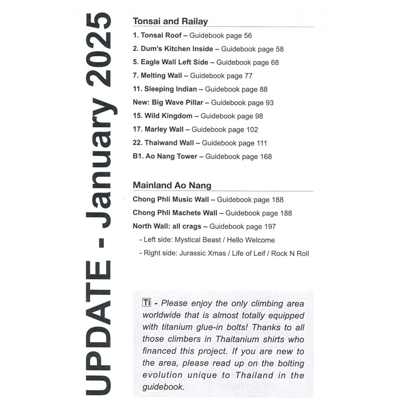 Es werden außerdem die Bouldermöglichkeiten auf Ko Tao beschrieben und natürlich jede Menge der Deep-Water-Soloing-Möglichkeiten vorgestellt. Es wird außerdem auf den Sanierungsstand hingewiesen, so dass man nur in wirklich sichere Routen einsteigt. Im Reiseteil sind darüber hinaus wichtige Infos zu finden, die man schon vor der Reise nach Thailand wissen sollte.