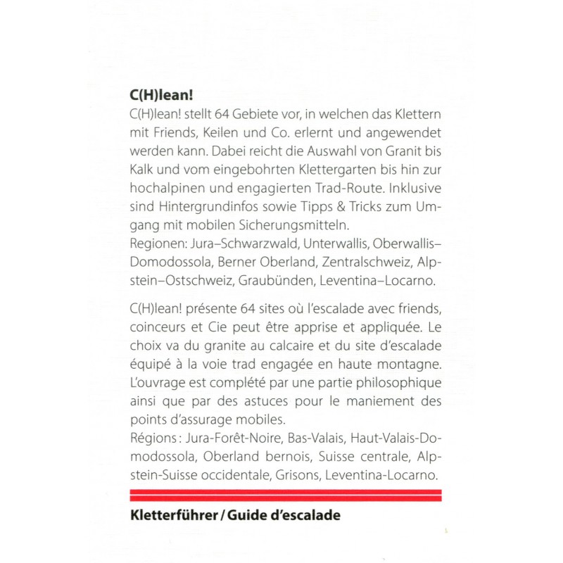 Unter dem Titel mit dem Wortspiel „C(H)lean!“ verbirgt sich ein Kletterführer, der 64 Gebiete in der Schweiz vorstellt, in welchem das Klettern mit Friends, Keilen und Co erforderlich ist. Doch keine Angst, ganz viele Routen sind einfach und sie eignen sich ideal, um das Legen mobiler Sicherungspunkte zu erlernen oder um Routine zu entwickeln. In vielen Routen stecken auch Bohrhaken und die Absicherung darf (je nach eigener Moral) ergänzt werden.