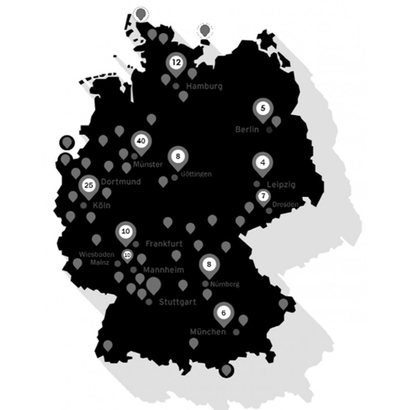Aachen, Chemnitz, Dresden, Fehmarn, Frankfurt am Main, Freiburg, Göttingen, Hamburg, Köln, Leipzig, Mainz, München, Münster, Nürnberg, Stuttgart uvw.
