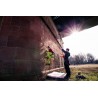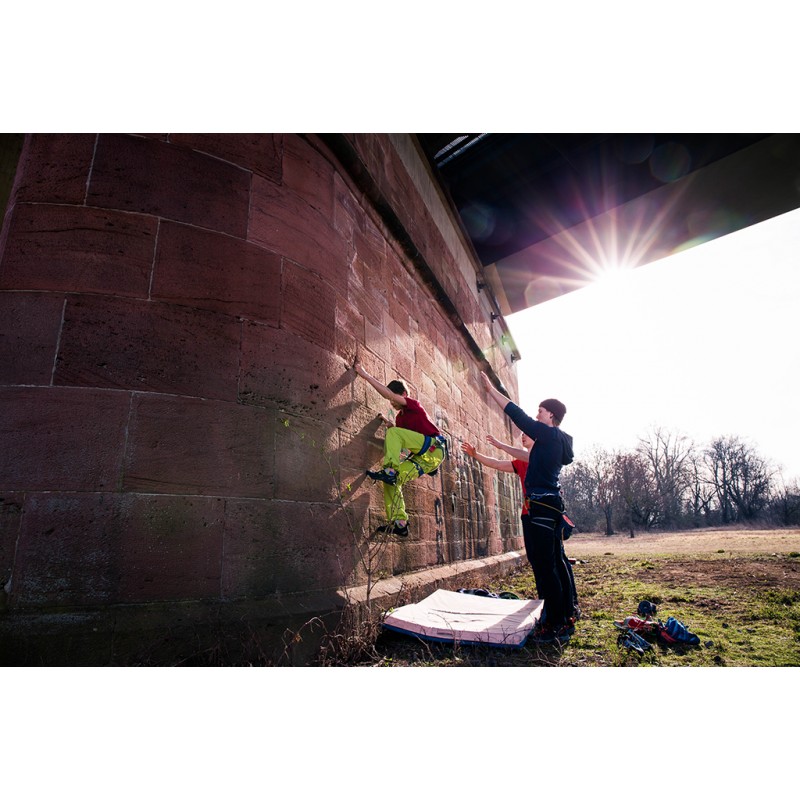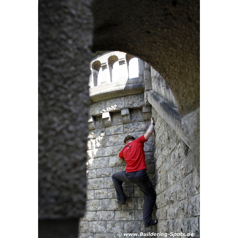 Der Ansatz von Buildering ist, ausgewählte Bauwerke, Brücken und Mauern als Kletter- und Boulder-Spots zu nutzen. Einen besonderen Reiz bieten die vielfältigen Strukturen und Materialien, die man greift.