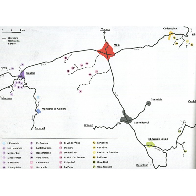 In vier Regionen (Calders, Moià, Collsuspina, Sant Quirze Safaja)aufgeteilt sind die Routen auf schönen aquarell gemalten Topos eingezeichnet.