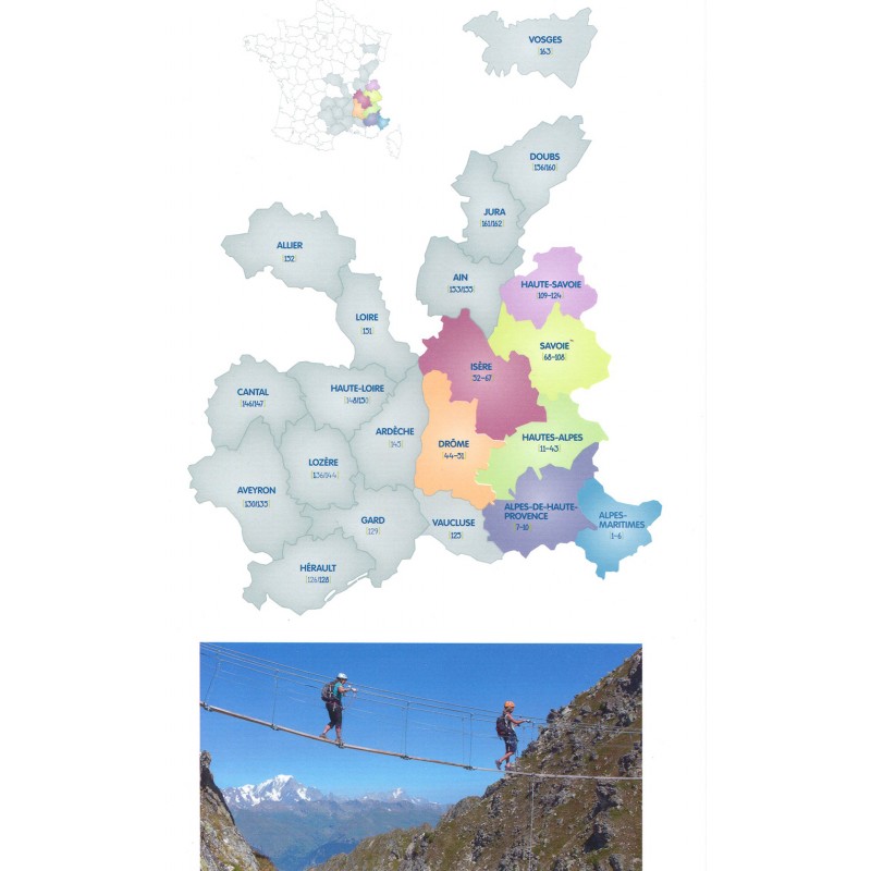 Atemberaubende Landschaften aus luftigen Höhen, tiefeingeschnittene Schluchten, weite Blicke übers Land… in 163 Klettersteigen ist von Nîmes bis Besançon, einschließlich des gesamten Zentrums Frankreichst und der Alpen vielseitiges Abenteuer beschrieben.