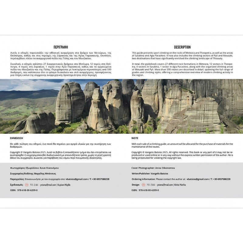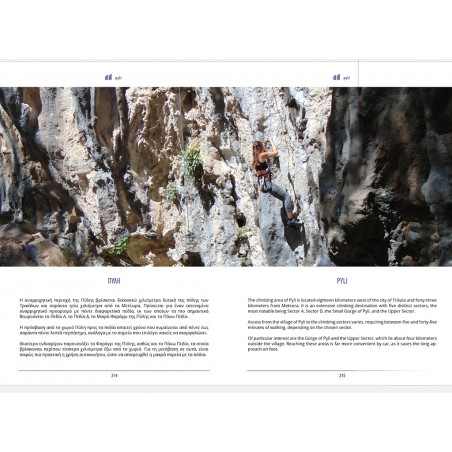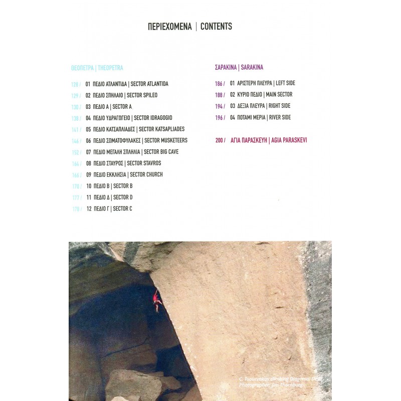 Im zweiten Teil des Buches werden die Kalkfelsen von Theopetra mit zwölf Sektoren, die in unmittelbarer Nähe sind, ebenso ausführlich und reichlich bebildert, beschrieben. Vom Felscharakter sind die Routen hier anders, aber genau das ist es, was den Aufenthalt in dieser Region so spannend macht. Desweiteren sind noch vier weitere Sektoren von Sarakina und der kleine Genusssektor Agia Paraskevi enthalten.