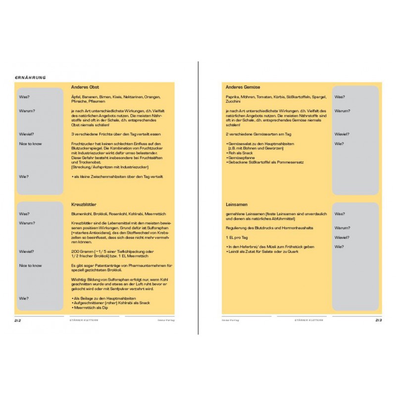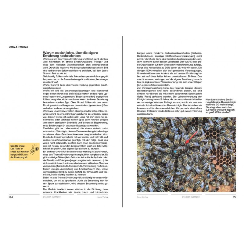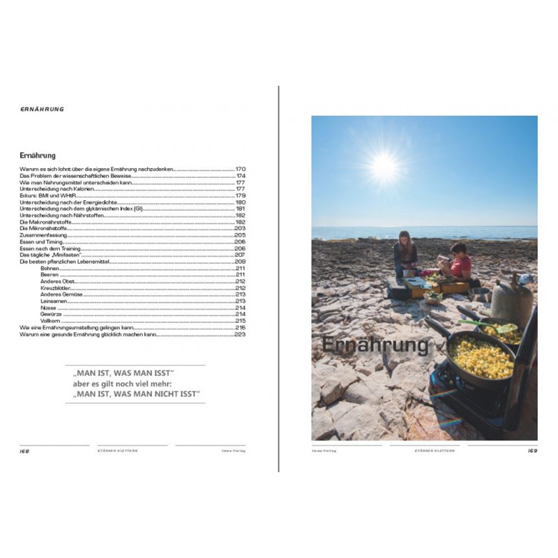 In den Kapiteln „Krafttraining“ und „Techniktraining“ findest du Grund- und Fachwissen sowie jede Menge praktischer Tipps, um dein Leistungsplateau zu überwinden. Das Kapitel „Mentales Training“ ist ein Augenöffner, um dein eigenes Verhalten, deine Einstellungen und Herangehensweisen an den Klettersport zu reflektieren. Im Kapitel „Ernährung“ wird die Lanze für gesundes Essen gebrochen und es heißt: „Man ist, was man NICHT isst“.
