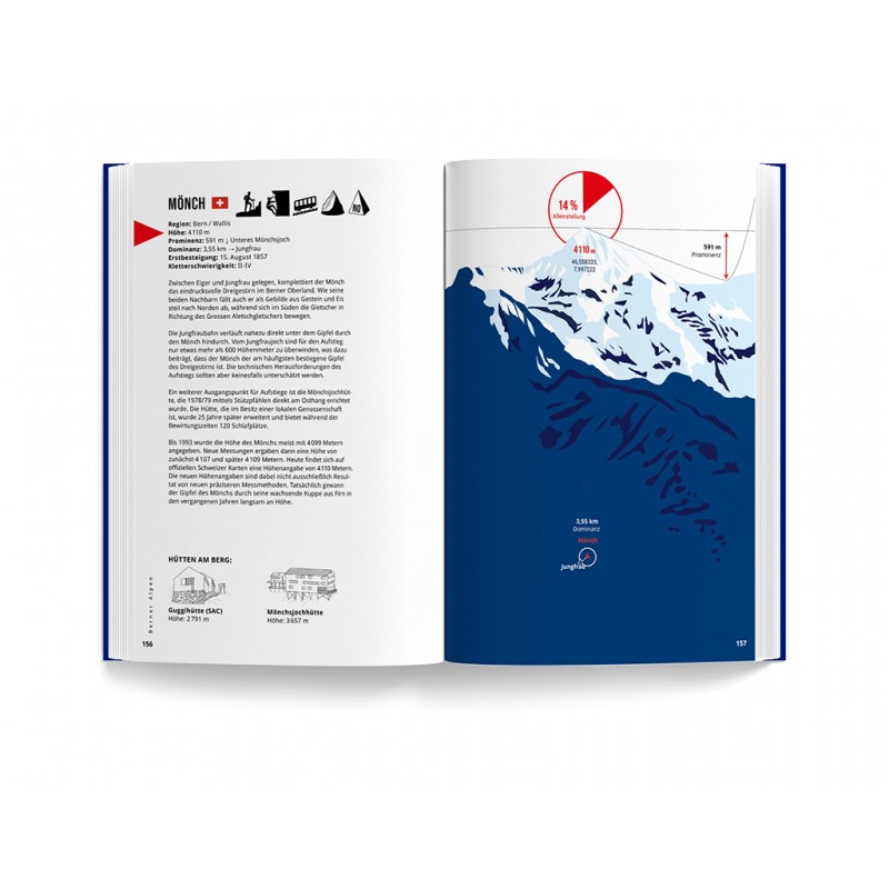 Alle Berge werden mit den wichtigsten geografischen Daten vorgestellt. Das Buch liefert Angaben rund um den Berg. Routenbeschreibungen sind nicht enthalten. Jedoch Fakten zur Bergsteigungsgeschichte, Schwierigkeiten des Aufstiegs und Infos zu den wichtigsten Berghütten in der Umgebung. Es präsentiert spezielle Kletter-, Wander- und Skitourenberge und Gipfel, an denen sich bereits heute die Folgen von Klimaveränderungen im Hochgebirge zeigen. Dazu gibt es zu jedem Berg weitere besondere Informationen und Geschichten. Ein Buch zum Stöbern und aufgrund der schönen Grafiken ein tolles Geschenk für jeden Bergliebhaber. Am besten gleich mal die Bilder durchklicken...