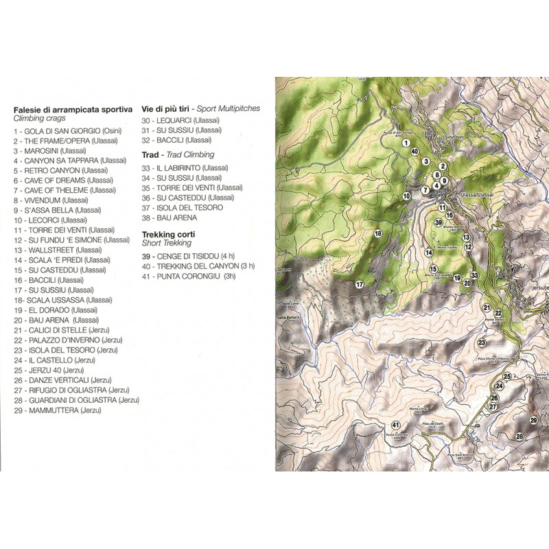 Vorgestellt werden 38 verschiedene Sektoren, und damit deutlich mehr als in der letzten Auflage. Der Zuwachs zeigt, dass in dieser Region Sardiniens gerade extrem viel Entwicklung steckt. Mit Routen in den mittleren und oberen Schwierigkeitsgraden ist damit die Auwahl noch einmal deutlich angestiegen und auch 6 Riss- bzw. Tradklettergebiete im Führer vorgestellt. Ganz einfache Anstiege sind eher nur spärlich vorhanden. Die Routen werden anhand von Topos oder Fototopos sowie auf Luftbildern beschrieben. Auf einigen Seiten werden noch ergänzend Wanderungen und die besten Strände in der Region vorgestellt.