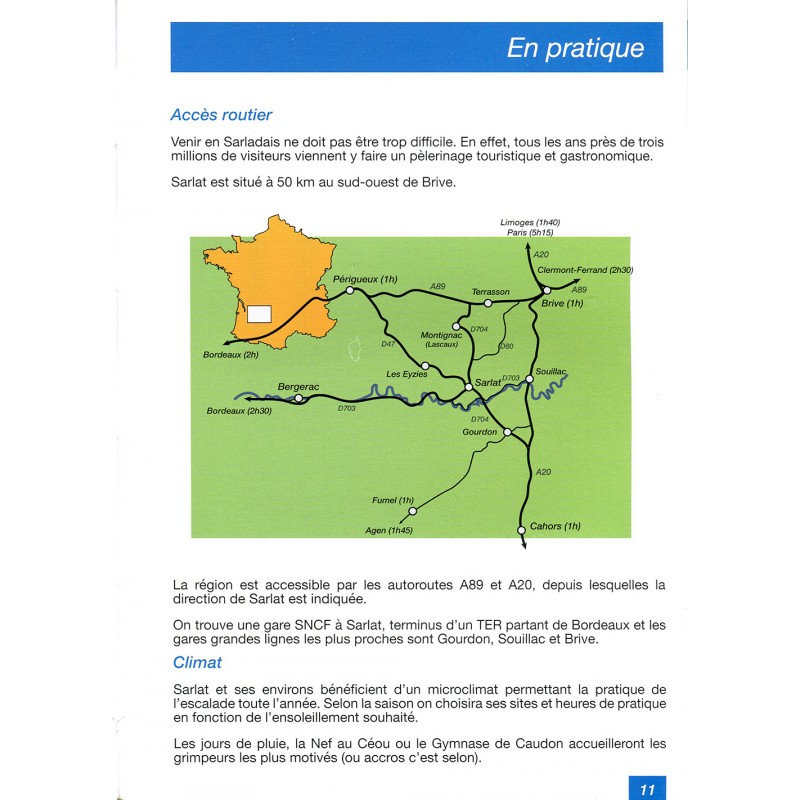 Eingeteilt in fünf Gebiete (Falaise du Céou, Vallée Dordogne, Pech de Mont, Falaise de Milhac und Falaise de Campagne) stellt dieser Topoführer die Klettermöglichkeiten rund um Sarlat im Südwesten von Frankreich im Département Dordogne vor.
