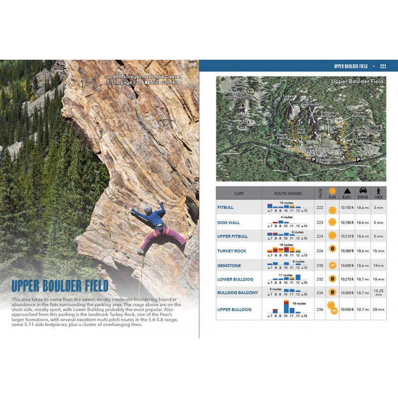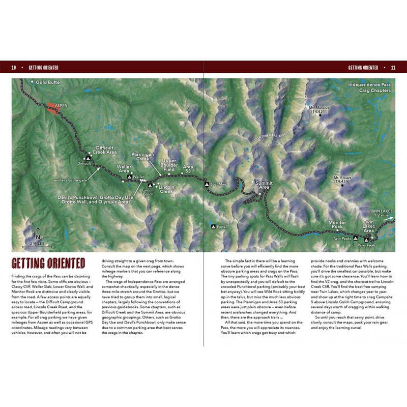 Zu den beliebtesten Gebieten gehören die „Grottos“, 10 Meilen östlich von Aspen, aber auch alle anderen Klettergebiete in der Umgebung sind gut dokumentiert und haben einiges zu bieten. Das neu eröffnete Gebiet „Gold Butte“, etwas außerhalb der Stadt bietet eine tolle Option für kaltes Wetter in einzigartigem Sandstein. Auf der anderen Seite des Passes werden die Klettermöglichkeiten am „Monitor Rock“ und am „Twin Lake“ vorgestellt. Es gibt viele neue Routen, die noch nie veröffentlicht wurden, darunter auch neue Mehrseillängenrouten, die viel Lob erhalten haben.
