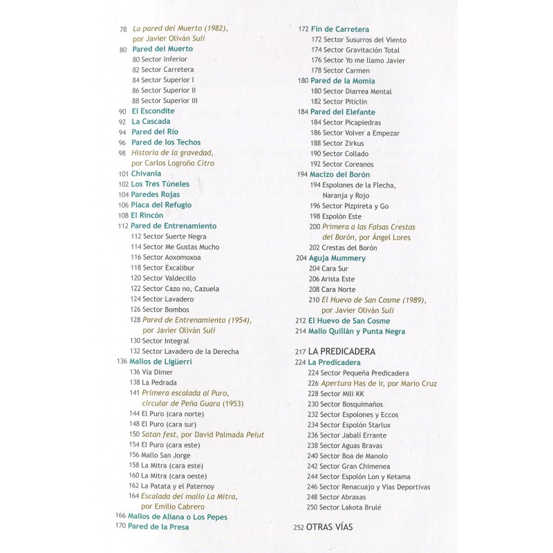Mehrere Generationen von Kletterern haben hier verschiedene Routen erschlossen, die das Niveau und die Mentalität der jeweiligen Epoche widerspiegeln. Von den Pionierrouten der 1950er Jahre bis zu den extrem schwierigen Sportkletterrouten von heute ist hier alles zu finden. Es gibt auch andere Gebiete in der Nähe, die jedoch ihren eigenen Charakter haben, wie z.B: San Martín de la Val d'Onsera und Peña Predicadera. Neben einigen Mehrseillängenrouten werden auch einige Bouldergebiete vorgestellt. Der Schwerpunkt des Führers liegt jedoch auf Sportkletterrouten.