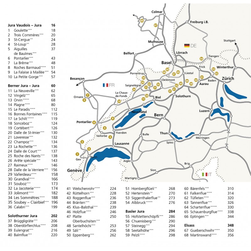 68 Plaisirklettergebiete im schweizerischen und französischen Teil des Jura.