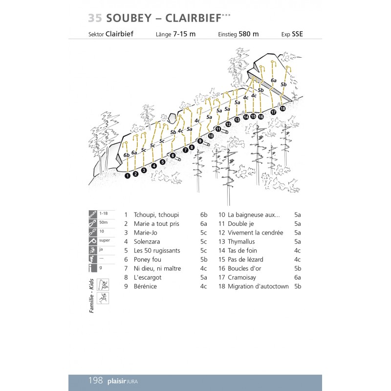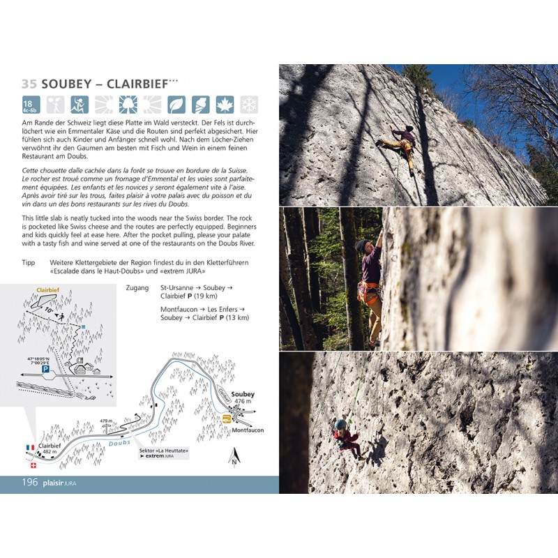 Plaisirgebiete im schweizerischen und französischen Teil des Juras beschreibt die Neuauflage des Führers 'Jura Plaisir'. Klettern zwischen Winzerhöfen und Burgruinen, auf Hochplateaus und in engen Schluchten, inmitten uralter Eichenwälder oder direkt über den Dächern der Stadt - all das gehört zum Jura. Während es im Waadtländer Jura nur wenige Klettergebiete gibt, sprießen die Klettergebiete im Berner, Solothurner und Basler Jura geradezu aus dem Boden und bieten dem Kletterer eine riesige Auswahl an verschiedenen Klettergebieten auf engstem Raum. Von Basel bis nach Baden sowie Yverdon im Westen der Schweiz werden alle lohnenden Felsen beschrieben, deren Routenangebot im Plaisirbereich zwischen 3a und 6b liegt. Sogar einige Felsen im französischen Teil des Juras, südlich von Besancon (bis nach Doups), sind beschrieben.