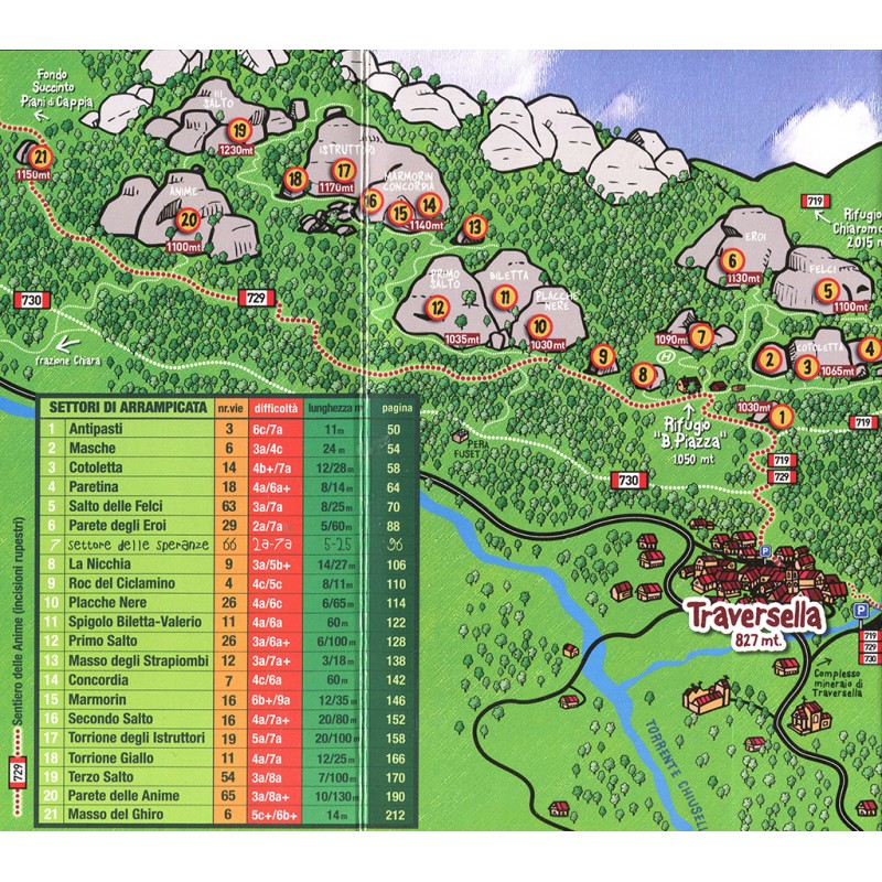 Kletternde Familien aufgepasst! Südlich von Aosta liegt Traversella auf 827 Meter Höhe. Rund um die Ortschaft gibt es besonders viele Genusstouren. Ideal für den Wechsel von der Halle an den Fels, Einsteiger und den Kletternachwuchs. Es sind aber auch ein paar Routen im französischen siebten Grad vorhanden, so dass Steigerungspotenzial reichlich vorhanden ist.