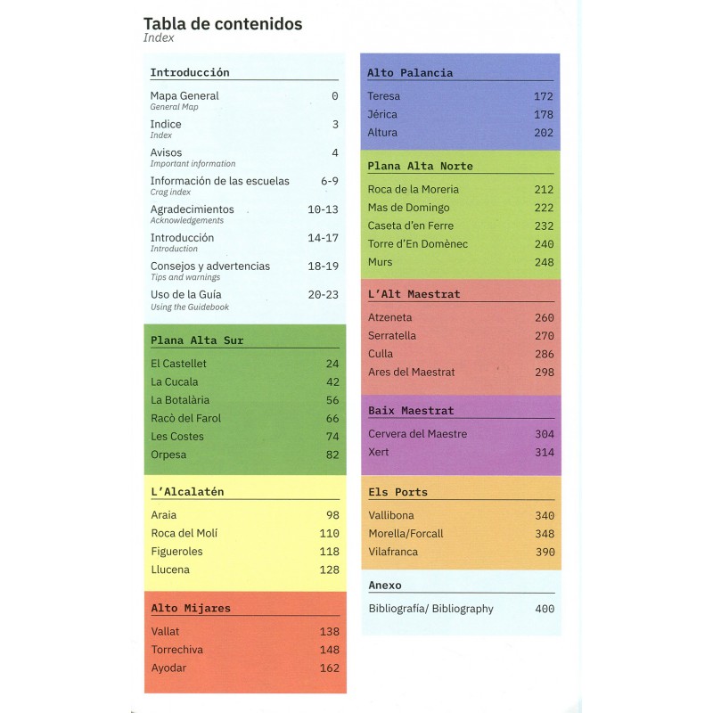 Mithilfe von QR-Codes und Übersichtsskizzen sowie kurzen Textergänzungen werden die Gebiete erreicht. Diese wählt man sich anhand der allgemeinen Informationen und Piktogramme aus. Vor Ort zeigen Fototopos die Routen mit den jeweiligen Schwierigkeiten an den Felsen. Die nebenstehenden Auflistungen geben Informationen zum Erstbegeher und zur Routenlänge. Fotos vermitteln einen weiteren Eindruck von der Kletterei. Die Schwierigkeiten sind wie so oft in Spanien über die ganze Bandbreite der Schwierigkeitsskala verteilt.