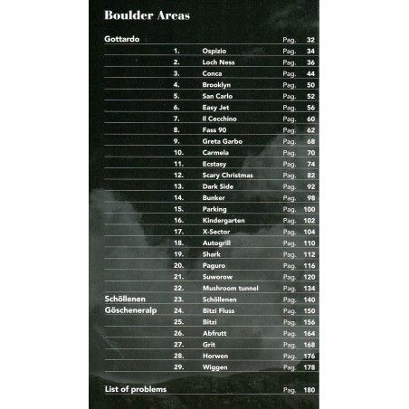 Lohnende Gebiete wie Mushroom Tunnel und Suworow sowie das Gebiet Shark sind nach wie vor im Führer. Neu hinzugekommen sind Schöllenen oder Kindergarten. Insgesamt 29 Gebiete mit über 1200 Bouldern von 3 bis 8c+. Mit zahlreichen Fototopos und Piktogrammen ein echter Leckerbissen für alle, die gerne in die Alpen zum Bouldern gehen.