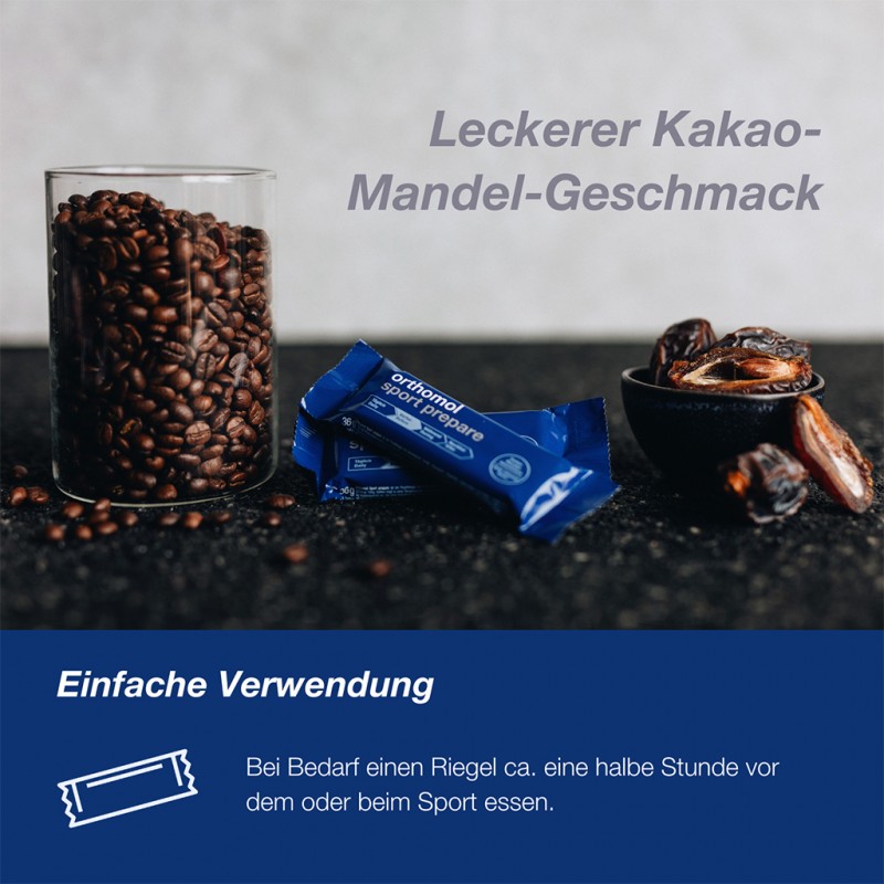 Du suchst nach einer Möglichkeit, deinen Körper vor dem Sport schnell & unkompliziert mit leistungsrelevanten Nährstoffen zu versorgen? Du bist fündig geworden, denn der kompakte Sportriegel Orthomol sport prepare wurde speziell zur Unterstützung deiner Leistungsfähigkeit konzipiert.