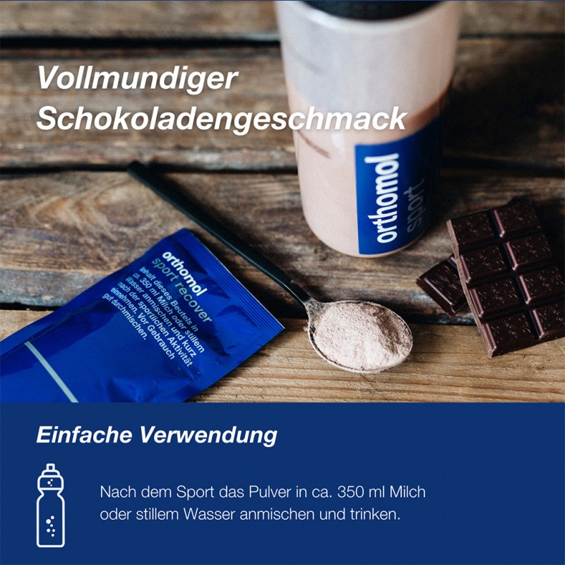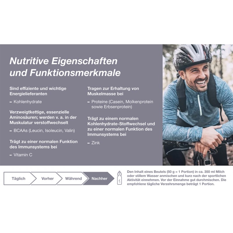 Den Inhalt eines Beutels (= 1 Portion) in ca. 350 ml Milch oder stillem Wasser anmischen und kurz nach der sportlichen Aktivität einnehmen. Vor der Einnahme gut durchmischen. Die täglich empfohlene Verzehrmenge beträgt 1 Portion.