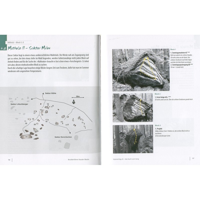 Wer kennt sie nicht, die Fotos von den gestreifen Boulderblöcken rund um Kandersteg? Jetzt ist erstmalig ein eigenständiger Führer über eines der größten Bouldergebiete der Schweiz erschienen und es ist erstaunlich, wie viele Blöcke in dem Tal zu finden sind und diese in ganz verschiedenen Gesteinsarten. Topografische Kartenausschnitte helfen die Gebiete zu finden. Die einzelnen Gebiete werden kurz vorgestellt, es wird auf Besonderheiten (wie Parkplatzsituation, Naturschutz etc.) hingewiesen, alle Boulder sind in Fototopos eingezeichnet und werden kurz beschrieben.