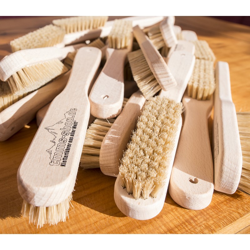 Boulder- bzw. Griffbürste mit Naturhaar, groß und dicht besetzt. Ideal um jede Art von Griffen (außer kleine Löcher) von Dreck und Chalkresten zu reinigen. Solltest du die Bürste mal im Wald verlieren, zersetzen sich Stiel und Borsten und es bleibt kein Plastik zurück.