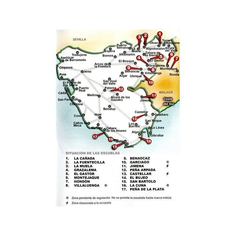 Tarifa ist eher als Surfspot bekannt. Doch wenn es Windstill ist, fahren viele der Surfer ins Hinterland, um sich an den Felsen sportlich zu betätigen. In den 17 vorgestellten Gebieten ist ein breites Spektrum an Routen vorhanden und so wird der Gelegenheitskletterer genauso seine Routen finden wie der "8a-Mann". Wer Lust auf längere Unternehmungen hat, findet sogar einige Mehrseillängenrouten.