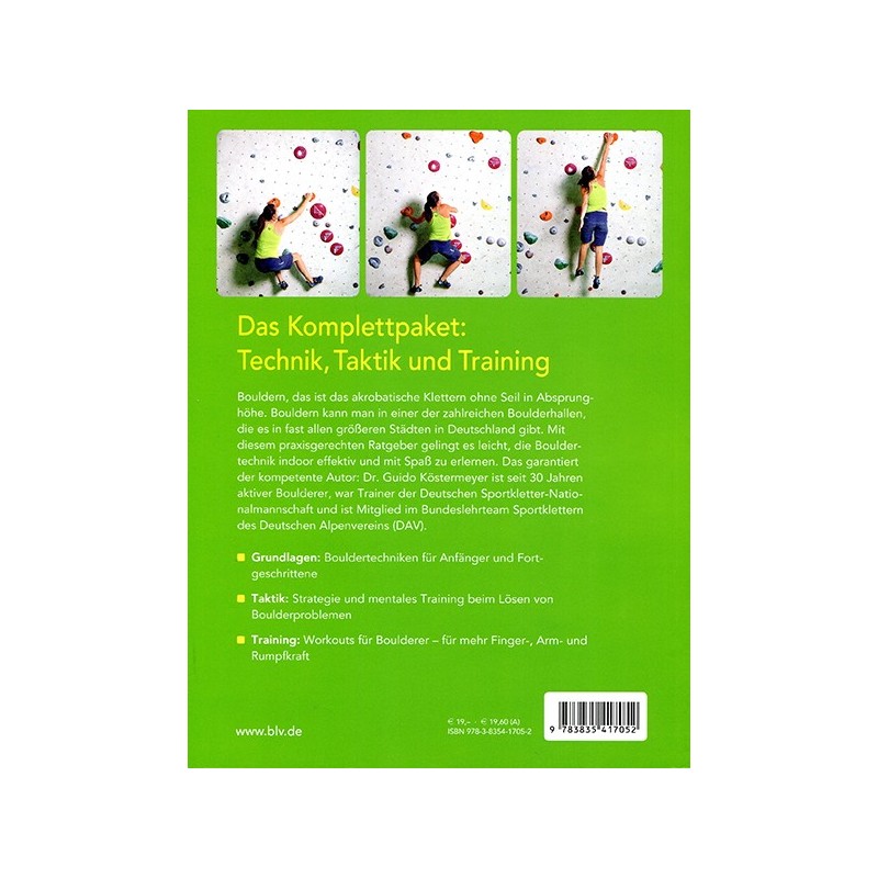 Boulderhallen gibt es in fast jeder größeren Stadt und diese sind mit Einsteigern, Fortgeschrittenen sowie Experten meist auch gut besucht. In diesem neuen Lehrbuch zeigt Guido Köstermeyer sehr praxisnah, wie sich die Sportart effektiv und mit Spaß erlernen lässt. Das Grundlagenkapitel zeigt Bouldertechniken: Es werden die verschiedenen Griffe und Tritte sowie der Hüfteinsatz präsentiert und durch viele Step-by-Step-Fotos veranschaulicht. Im Taktik-Kapitel geht es um Strategie und Mentales Training - hier beschreibt der Autor, wie sich Boulderprobleme lösen lassen. Die vielen Trainingsprogramme helfen Boulderern zudem, ihre Stützkraft, Rumpfkraft und Beinkraft sowie die Beweglichkeit zu steigern. In einem Zusatzkapitel geht Köstermeyer noch auf das Bouldern mit Kindern ein und was dabei zu beachten ist. Das Begriffsregister hinten im Buch erleichtert den Einsteigern das Verständnis des Fachjargons.