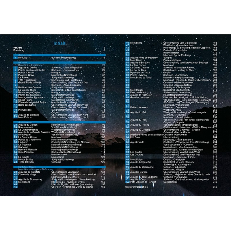 Die im Buch vorgestellte Auswahl der Fels- und Eistouren beginnt im Süden mit dem Monviso, umfasst die wichtigsten Berge in der Dauphiné und den Grajischen Alpen und beinhaltet als Schwerpunkt die Mont Blanc Gruppe. Die Bandbreite reicht von Klassikern wie der Überschreitung des Mont Blanc oder der Meije über wenig bekannte Hochtouren in der Vanoise bis hin zu den modernen Alpinkletterrouten an den Aiguilles von Chamonix oder an den Aiguilles Dorées. Aber auch besondere Varianten und Gipfel, die man ganz sicher als spannende Geheimtipps bezeichnen kann, werden beschrieben.