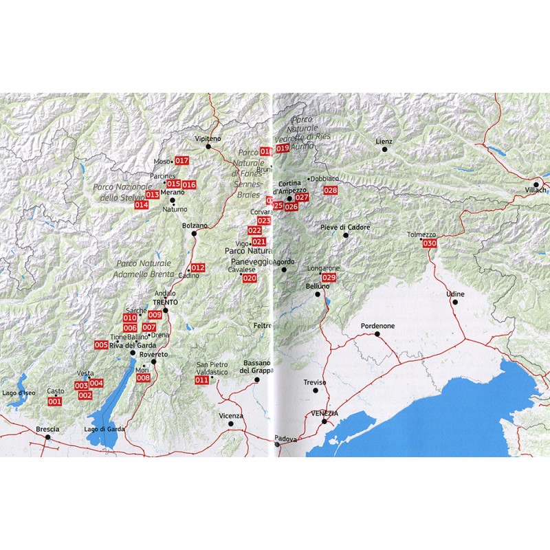 30 Klettersteige verstreut von der Provinz Brescia bis nach Friaul, durch die Dolomiten und die Südtiroler Berge.