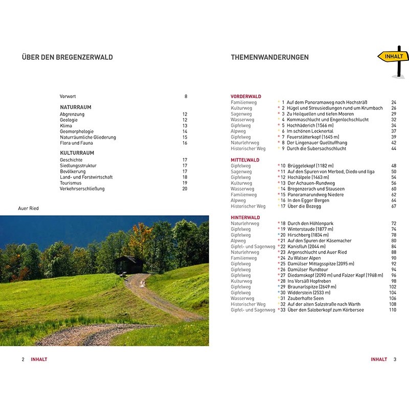 Dieser Wanderführer stellt 33 Themenwanderungen vor, wobei es sich dabei fast durchgehend um Rundwege handelt: Kulturwege, historische Wege, Sagenwege, Alpwege, Naturlehrpfade, Familienwege, Wasserwege und Gipfelwege. Zusätzlich werden fünf Weitwanderrouten von zwei bis vier Tagen beschrieben, die auch in einzelnen Tagesetappen begangen werden können: zwei Höhenwege, ein Dörferweg, ein Bergweg und eine Route entlang der Bregenzerach.