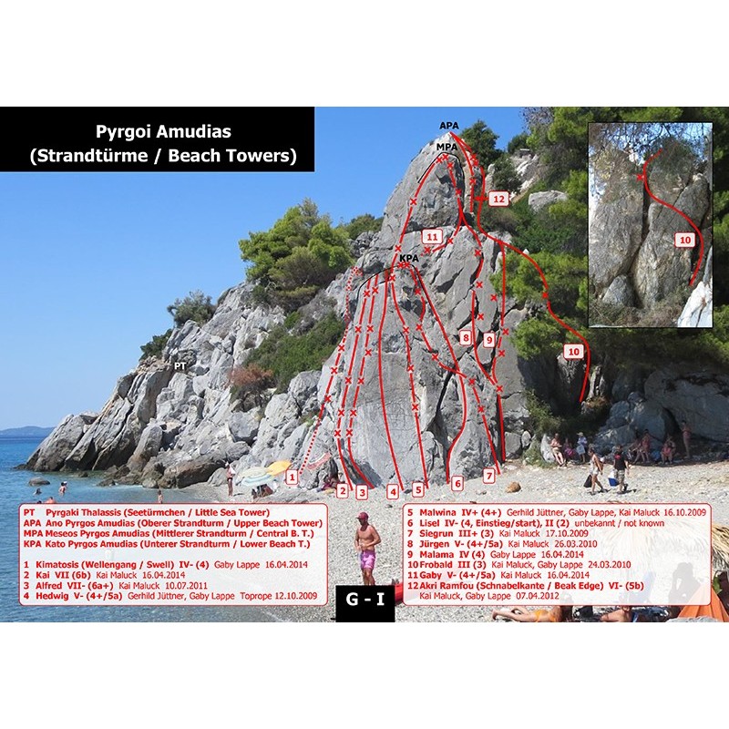 Close to Thessaloniki, the rock climbing area of Loutra on Chalkidiki / Greece offers beautiful bouldering opportunities and longer climbs right above the sea. It is even suitable for the hot summer season and ideal for families as one can perfectly combine beach life and rock climbing.